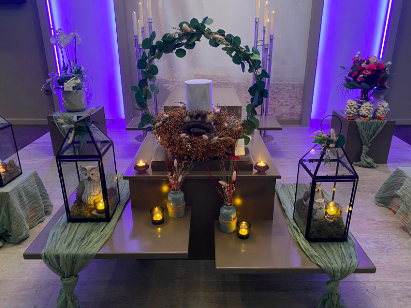 We verzorgen het afscheidsmoment door de omgeving sereen in te richten met persoonlijke spullen of kleine elementen die aansluiten bij de persoonlijkheid van de overleden persoon.